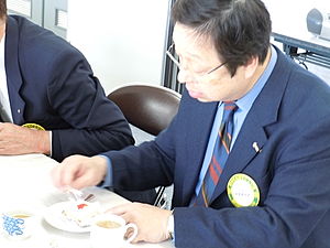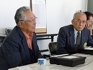 ![]() 于さんを紹介する西山委員長 | ![]() 話を始める于さん |