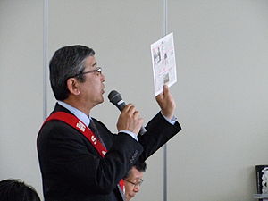 ![]() プログラムを紹介する宮野委員長 | ![]() 話を始める山北さん |